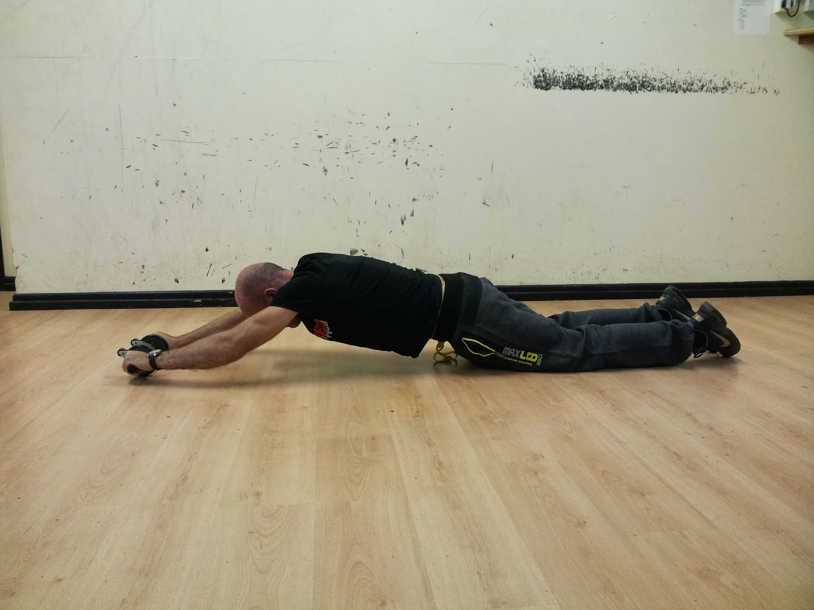 - at any given time during the movement, there should only be three points of contact with the ground: the ab wheel, and your knees or your feet, depending on which variation you are doing.