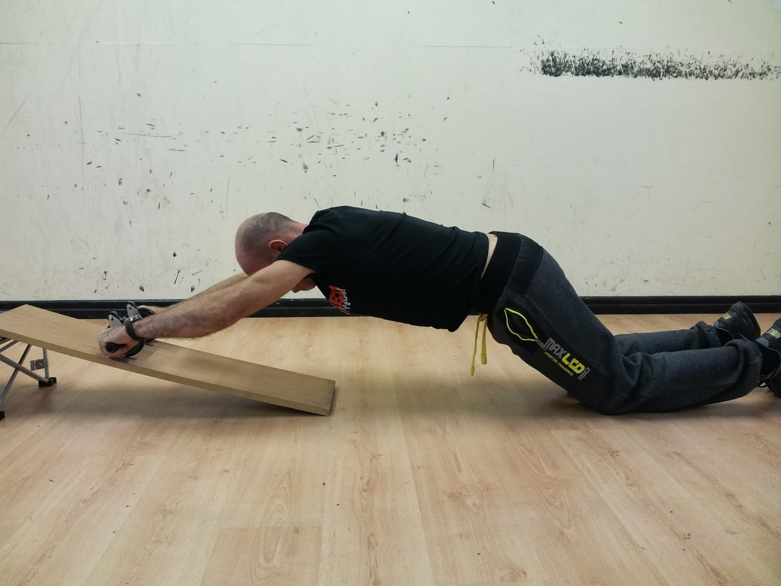 1. Incline knee rollouts. Start on your knees, and roll the wheel as far forward as possible without touching the floor on an incline. This could be a plank you are using for this purpose, or the exercise could simply be performed on a sloping surface such as a driveway, etc.