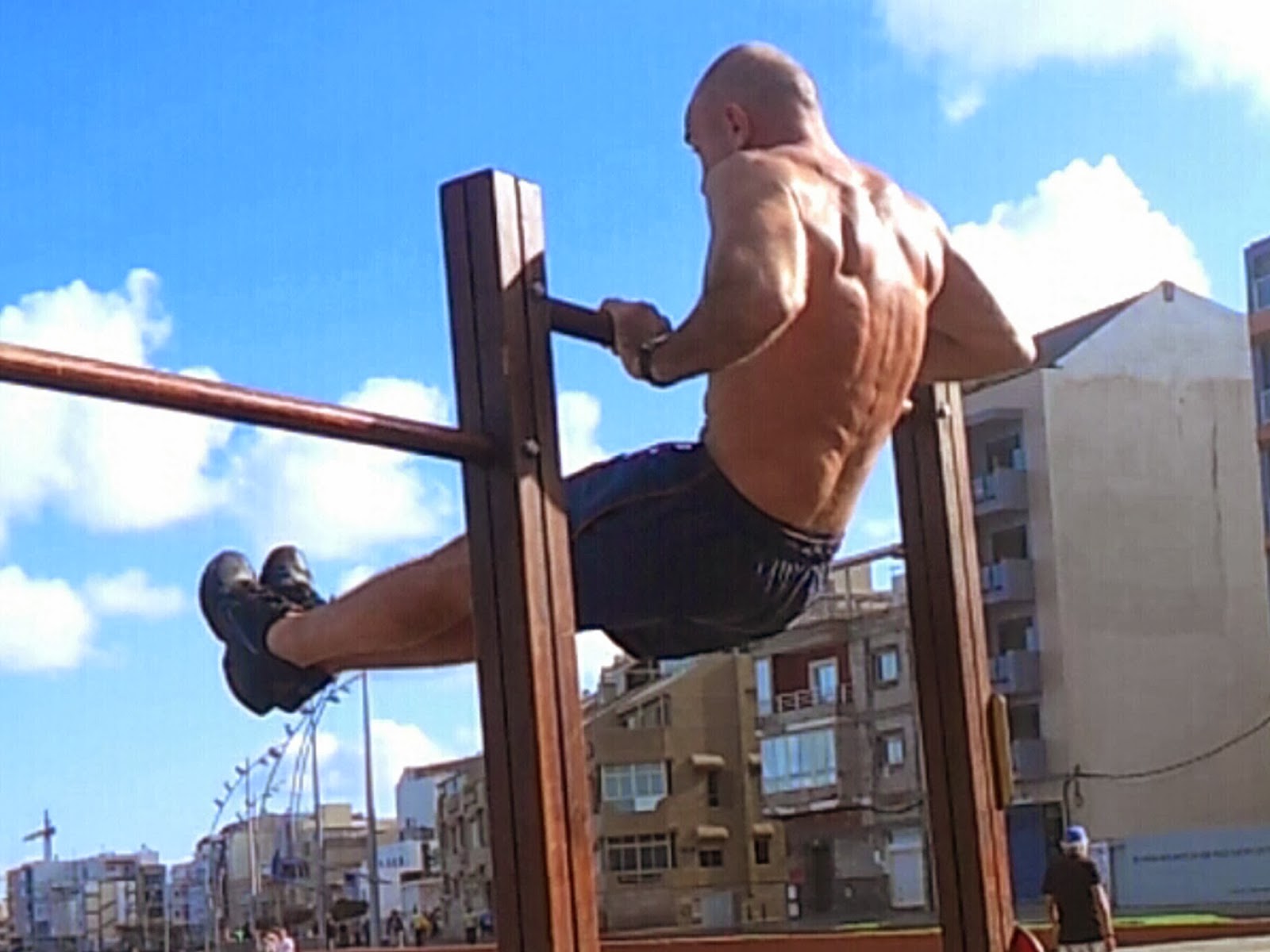 A note on the position of the legs: looking at the two pictures above or at the video, you will notice that my outstretched legs come under the bar. This occurs naturally to provide balance when performing sternum or belly button pull ups.