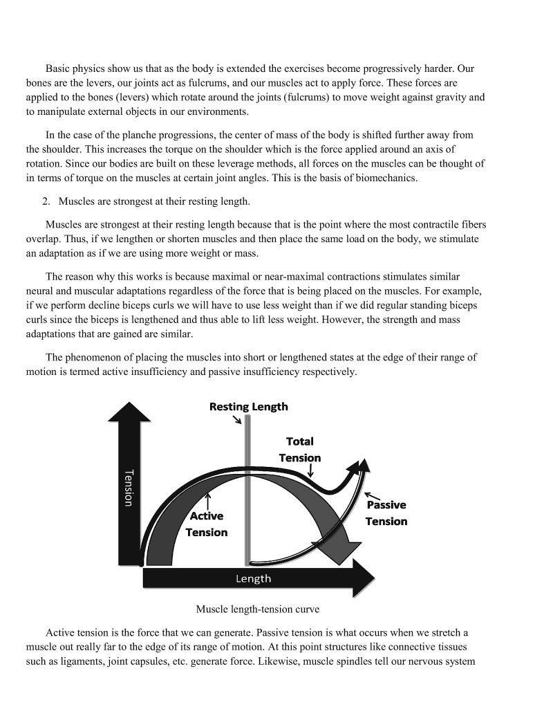 In the case of the planche progressions, the center of mass of the body is shifted further away from the shoulder. This increases the torque on the shoulder which is the force applied around an axis of rotation. Since our bodies are built on these leverage methods, all forces on the muscles can be thought of in terms of torque on the muscles at certain joint angles. This is the basis of biomechanics.