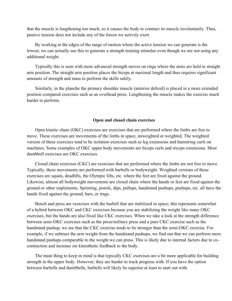 In summary, closed chain exercises emphasize that the body stabilize itself through the core and extremities because of its interaction with the ground, parallettes, or rings. This means that bodyweight exercises tend to rely more on progressions rather than adding weight. They are extremely good in both the development of strength, proprioception, and kinesthetic awareness. When you can add weight to them such as with a weighted vest it makes progressions much easier to handle. We will discuss multiple ways 10 do this later in the sample programming section.