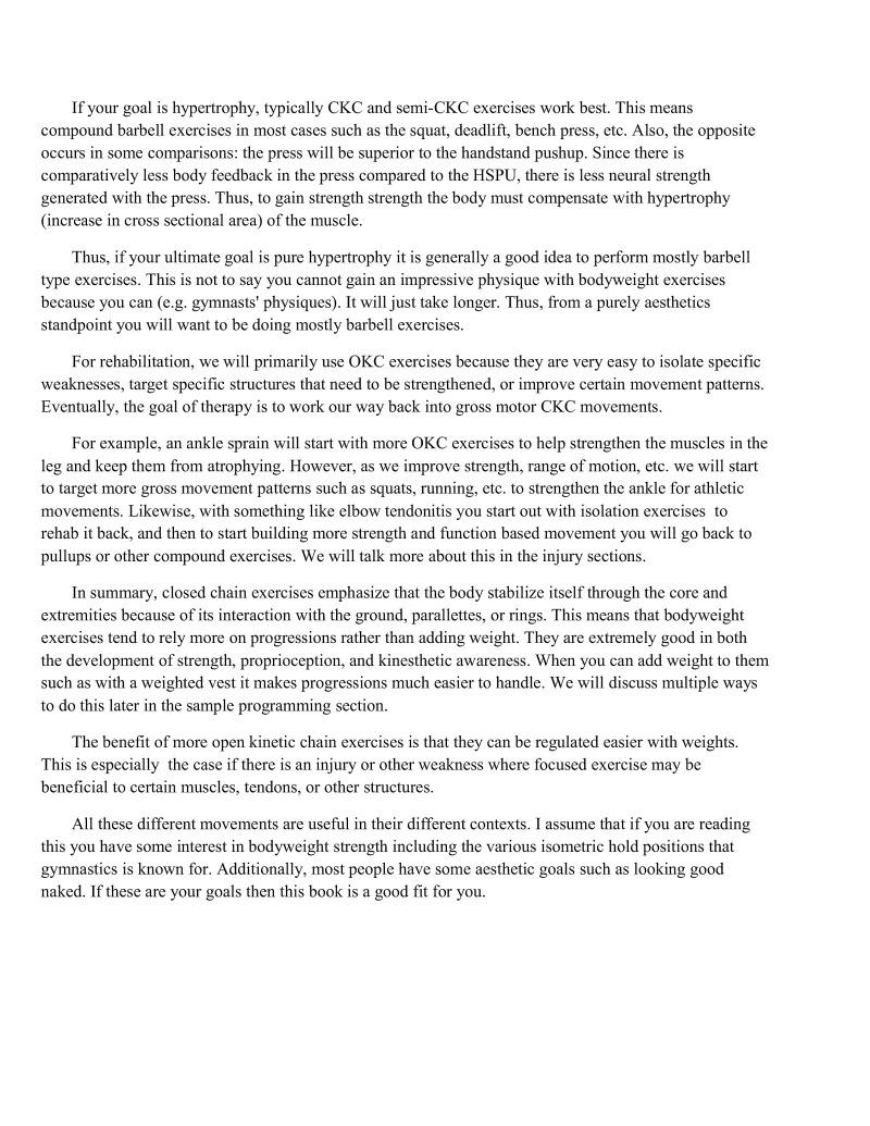 Al these different movements are useful in their different contexts. I assume that if you are reading this you have some interest in bodyweight strength including the various isometric hold positions that gymnastics is known for. Additionally, most people have some aesthetic goals such as looking good naked. If these are your goals then this book is a good fit for you.