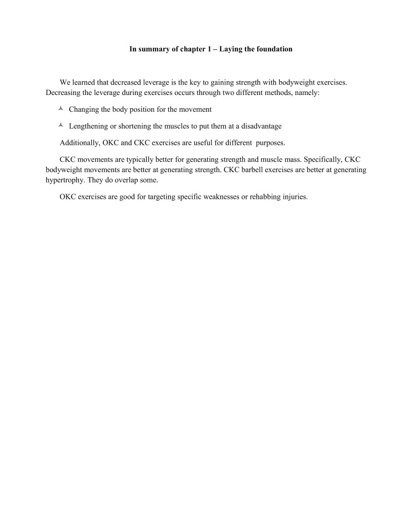 We learned that decreased leverage is the key to gaining strength with bodyweight exercises. Decreasing the leverage during exercises occurs through two different methods, namely: