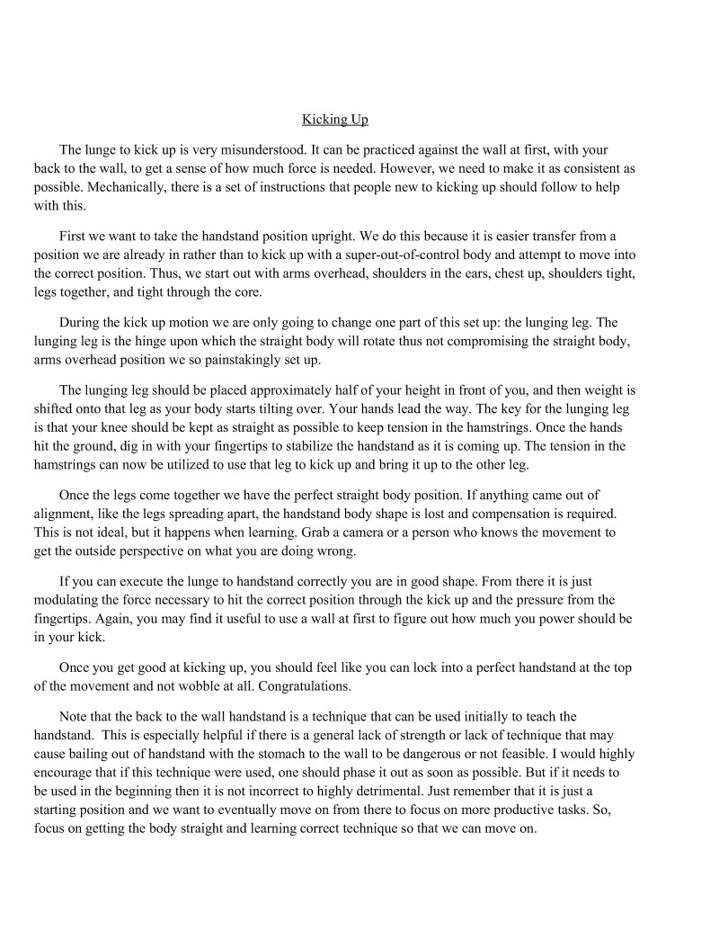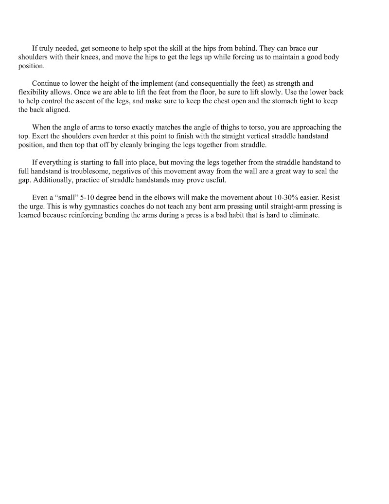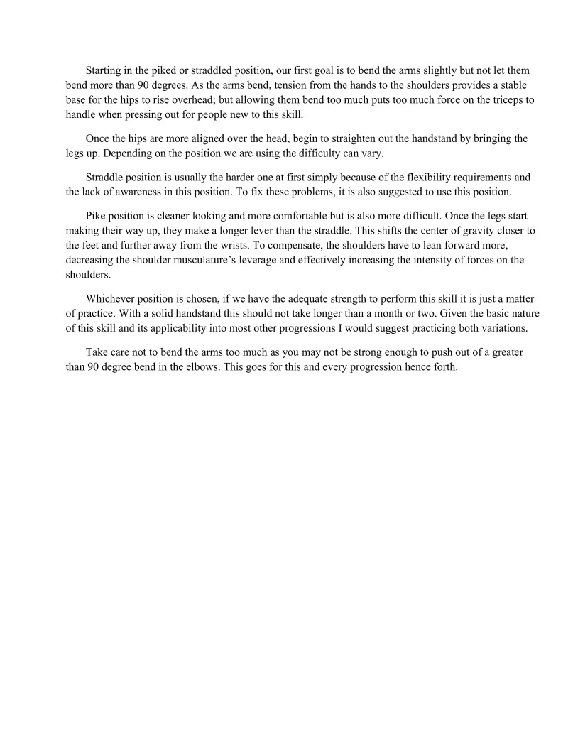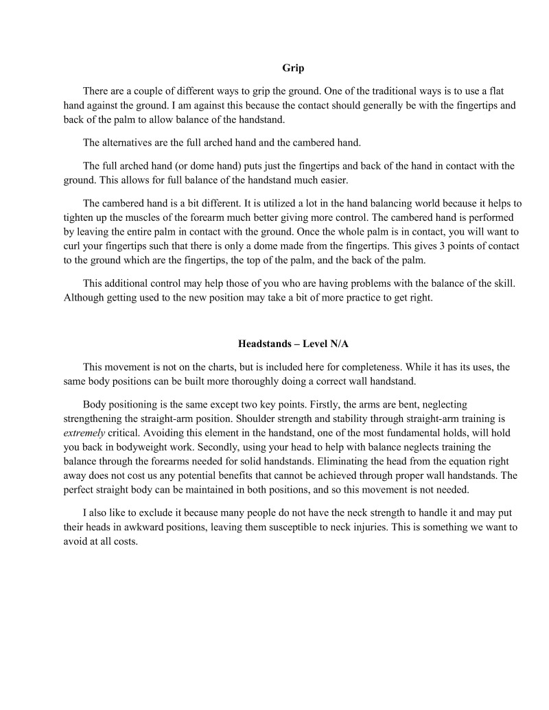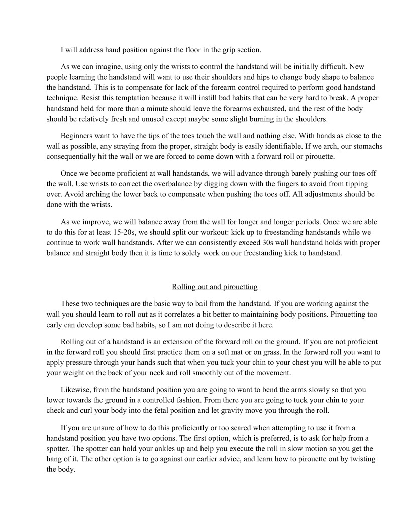 Volumes could be writien on many of the singular techniques such as handstands. Important information regarding these techniques will be condensed so that one will not be required to read essays for every single technique but will still understand the important points. Unfortunately, some of the finer details are beyond the scope of this particular book.