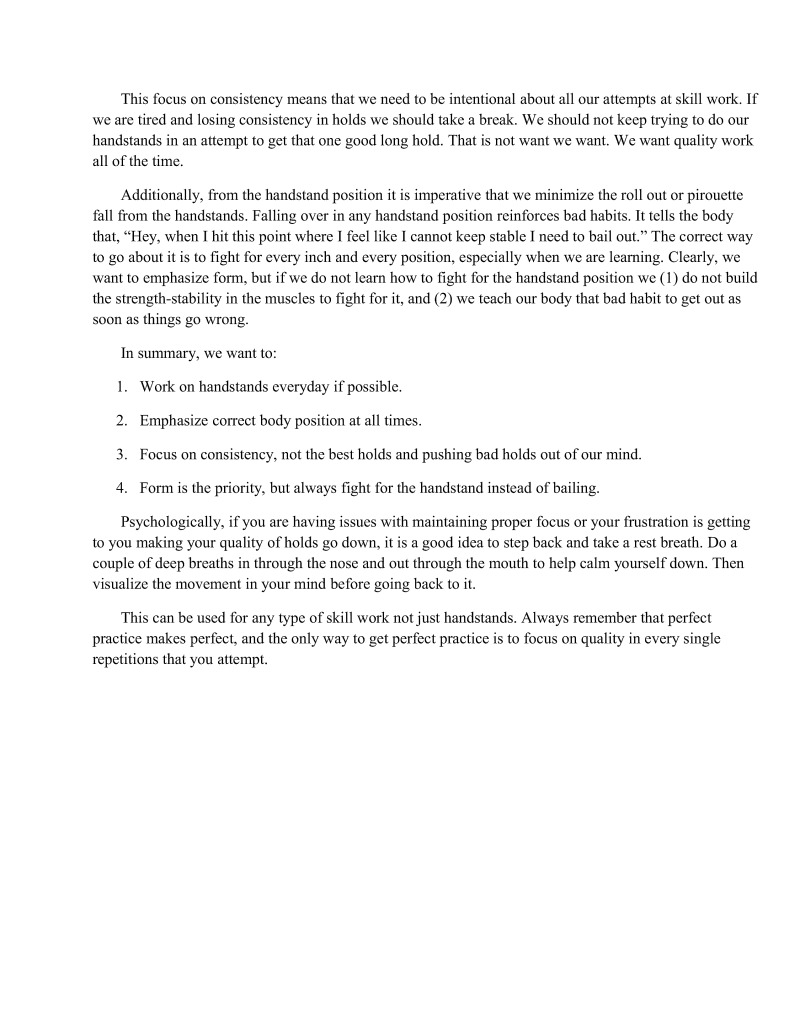 This can be used for any type of skill work not just handstands. Always remember that perfect practice makes perfect, and the only way to get perfect practice is to focus on quality in every single repetitions that you attempt.