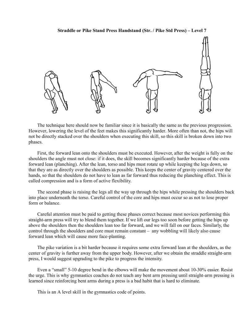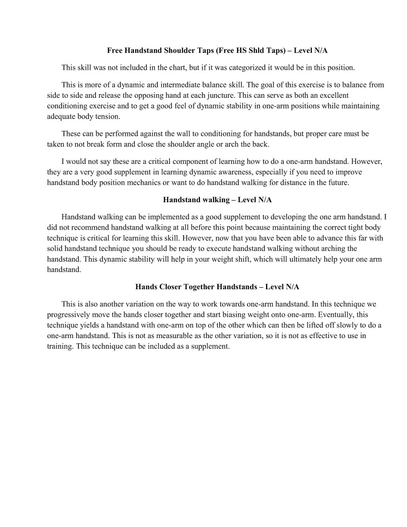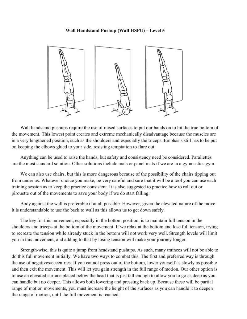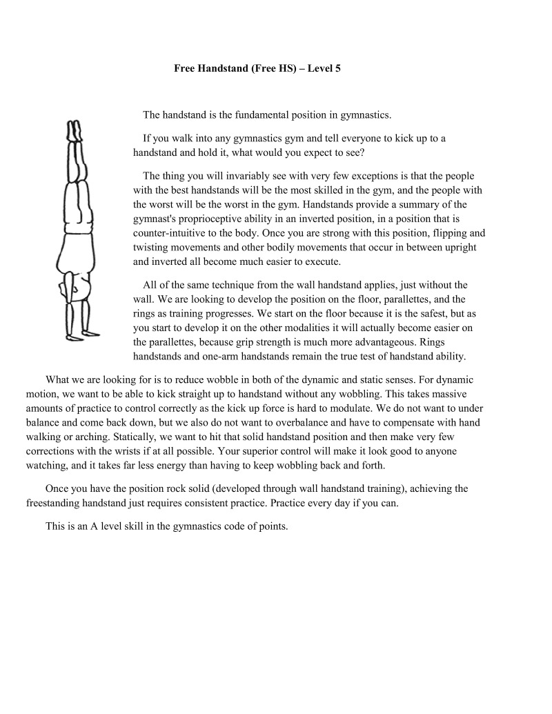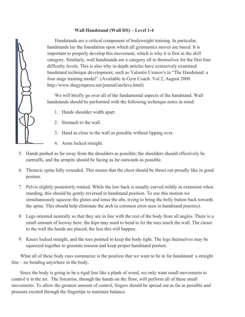 Handstands are a critical component of bodyweight training. In particular, handstands lay the foundation upon which all gymnastics moves are based. It is important to properly develop this movement, which is why it is first in the skill category. Similarly, wall handstands are a category all to themselves for the first four difficulty levels. This is also why in-depth articles have extensively examined handstand technique development, such as Valentin Uzunov's in "The Handstand: a four stage training model". (Available in Gym Coach: Vol 2, August 2008 http://www.thegympress.net/journal/archive.html)