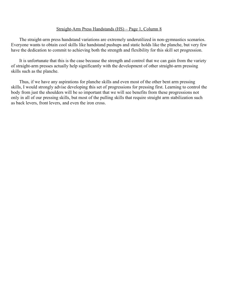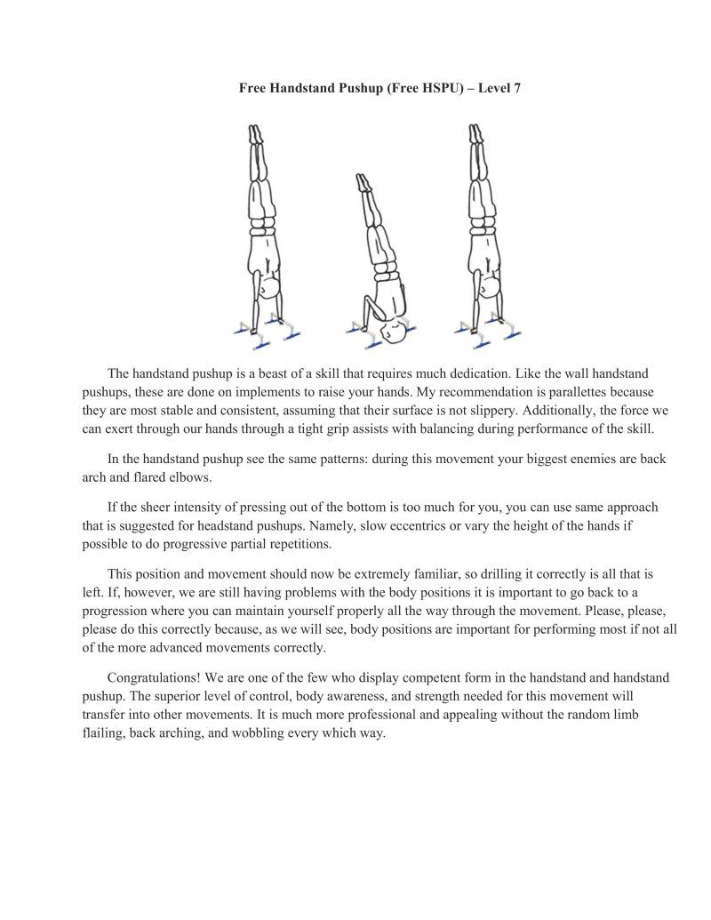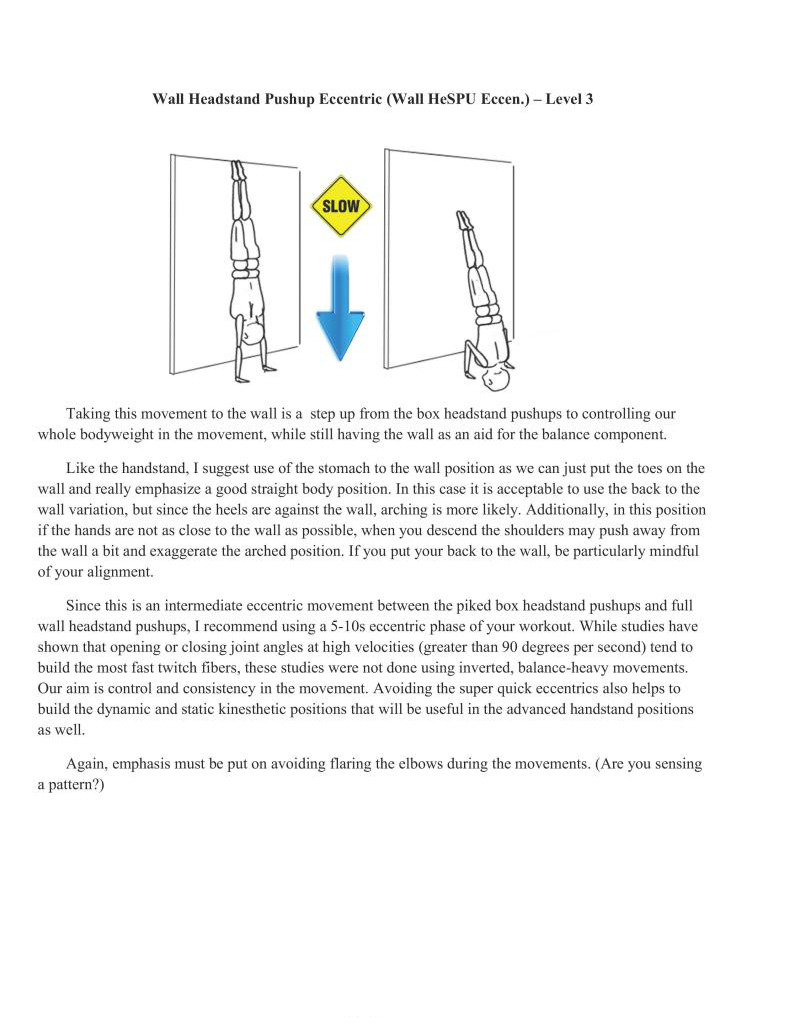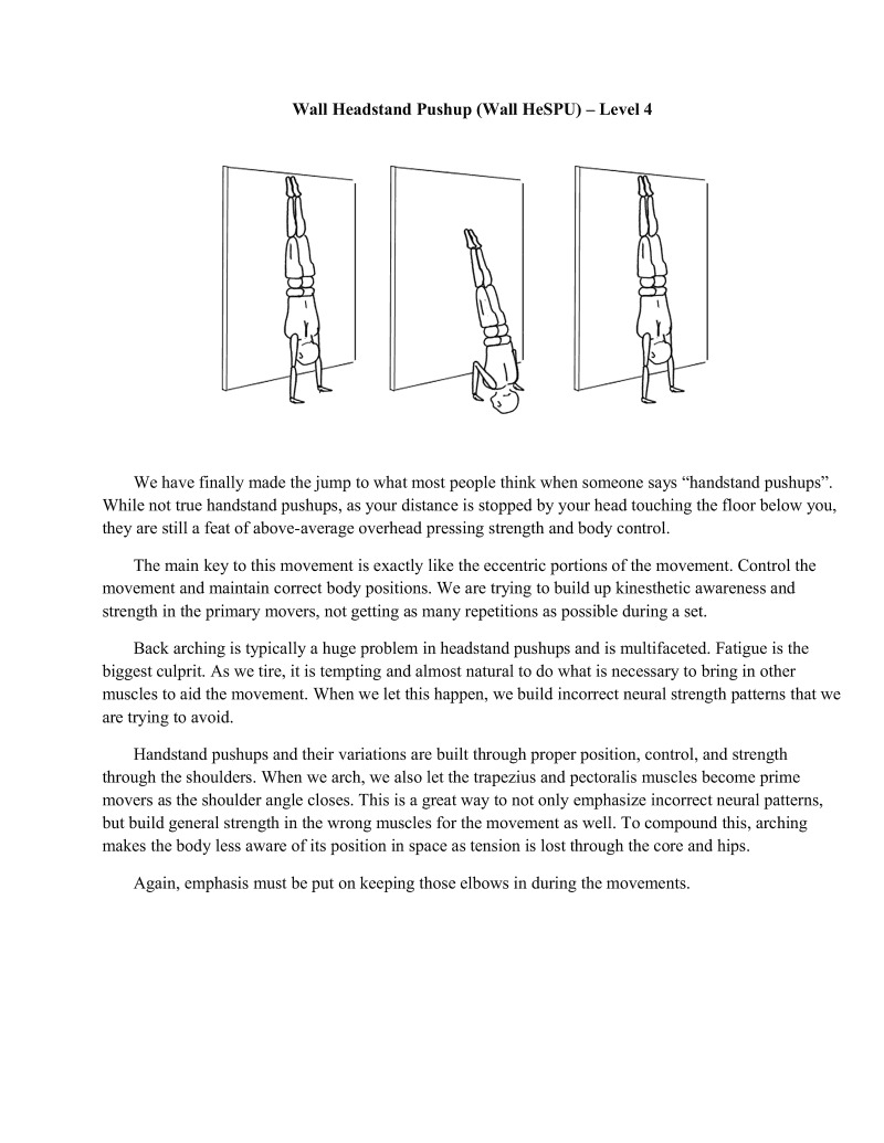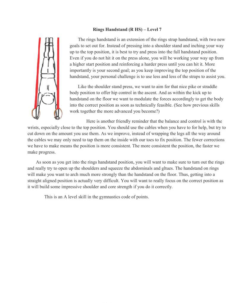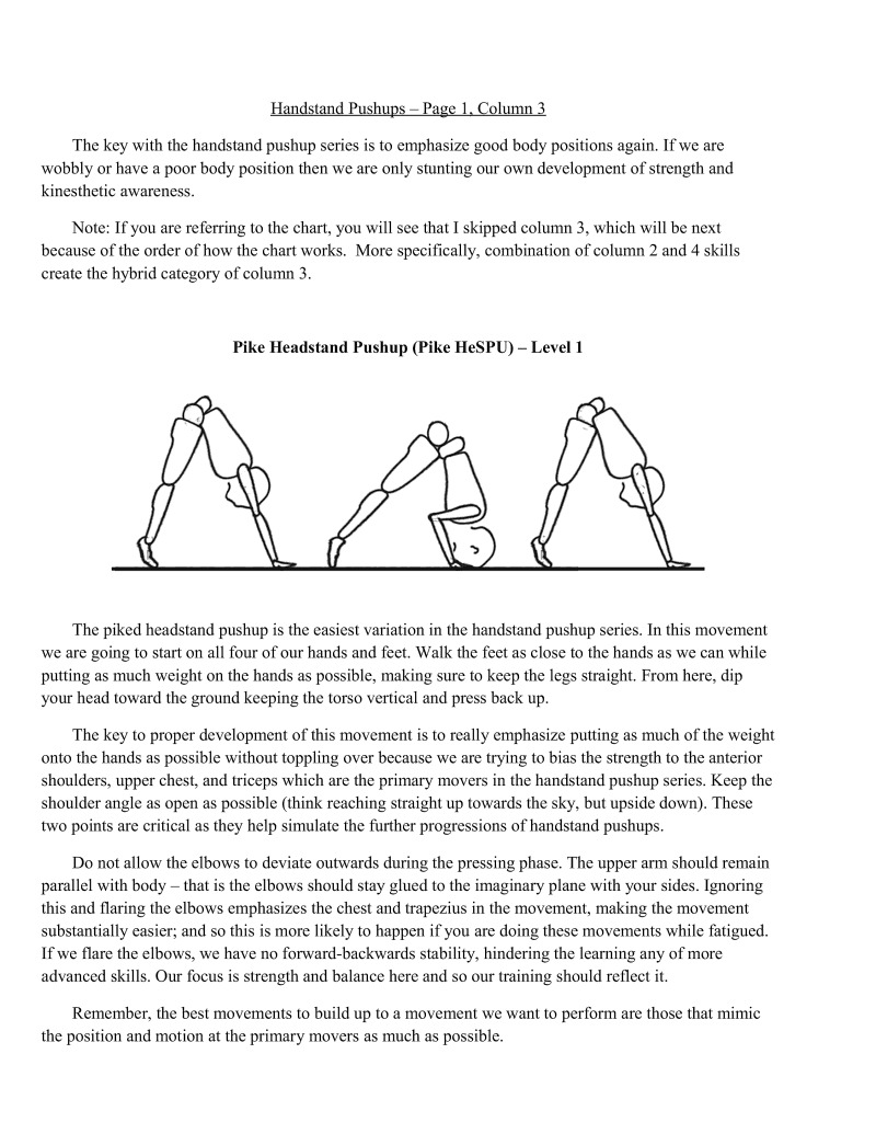 Handstands are a critical component of bodyweight training. In particular, handstands lay the foundation upon which all gymnastics moves are based. It is important to properly develop this movement, which is why it is first in the skill category. Similarly, wall handstands are a category all to themselves for the first four difficulty levels. This is also why in-depth articles have extensively examined handstand technique development, such as Valentin Uzunov's in "The Handstand: a four stage training model". (Available in Gym Coach: Vol 2, August 2008 http://www.thegympress.net/journal/archive.html)