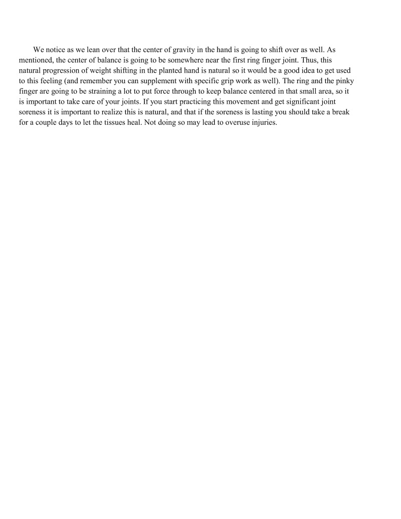 We notice as we lean over that the center of gravity in the hand is going to shift over as well. As mentioned, the center of balance is going to be somewhere near the first ring finger joint. Thus, this natural progression of weight shifting in the planted hand is natural so it would be a good idea to get used o this feeling (and remember you can supplement with specific grip work as well). The ring and the pinky finger are going to be straining a lot to put force through to keep balance centered in that small area, so it is important to take care of your joints. If you start practicing this movement and get significant joint soreness it is important to realize this is natural, and that if the soreness is lasting you should take a break for a couple days to let the tissues heal. Not doing so may lead to overuse injuries.