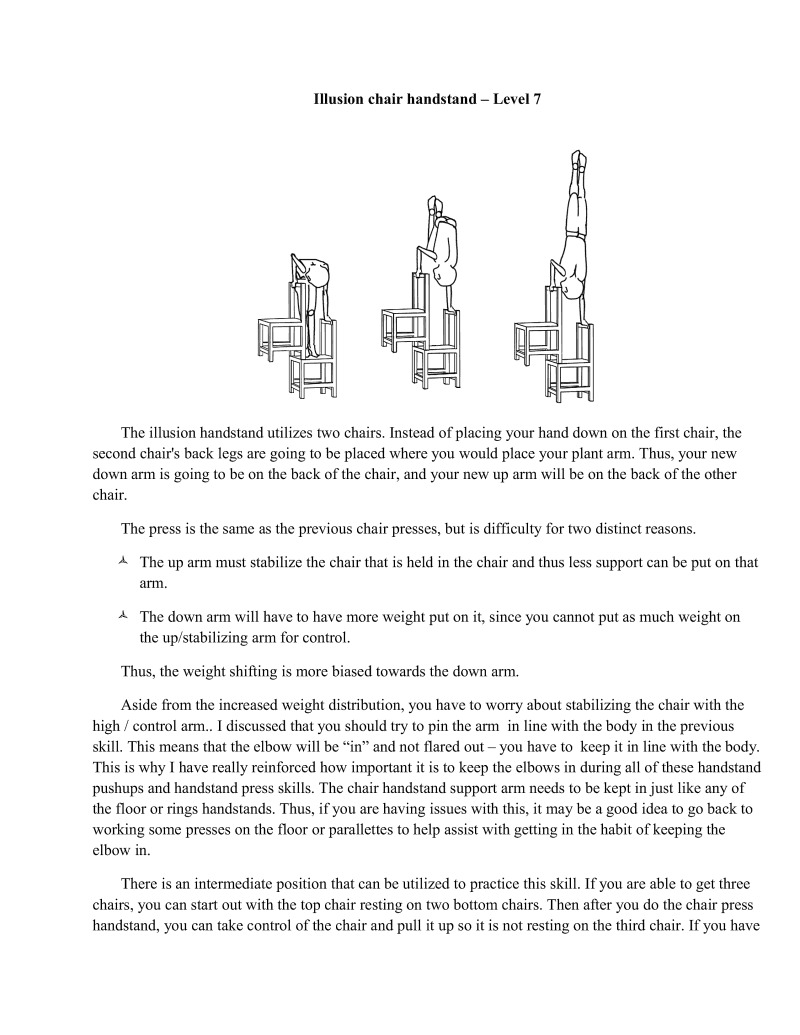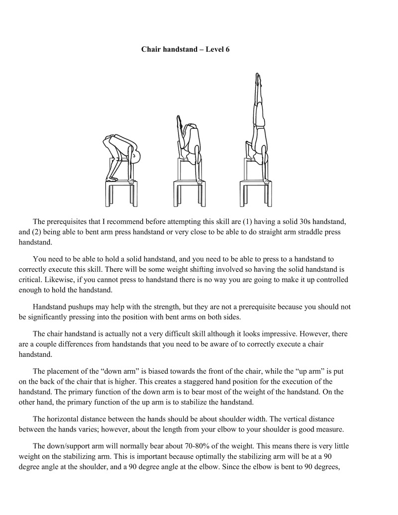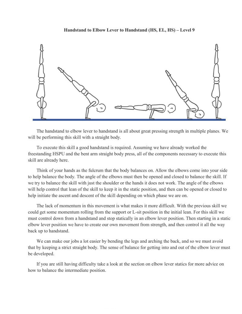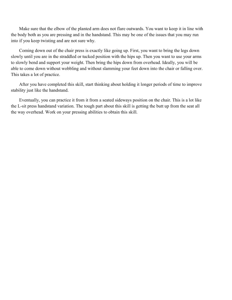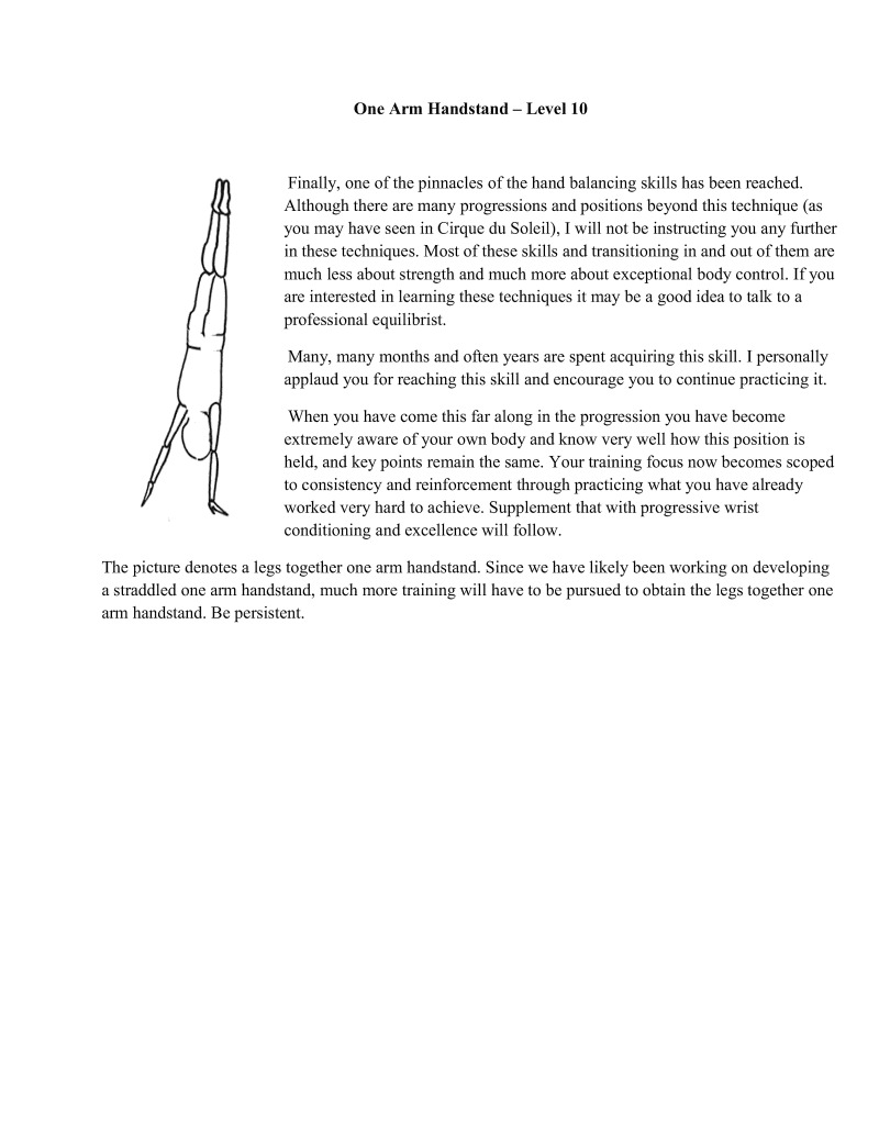 Finally, one of the pinnacles of the hand balancing skills has been reached. Although there are many progressions and positions beyond this technique (as you may have seen in Cirque du Soleil), I will not be instructing you any further in these techniques. Most of these skills and transitioning in and out of them are much less about strength and much more about exceptional body control. If you are interested in learning these techniques it may be a good idea to talk to a professional equilibri