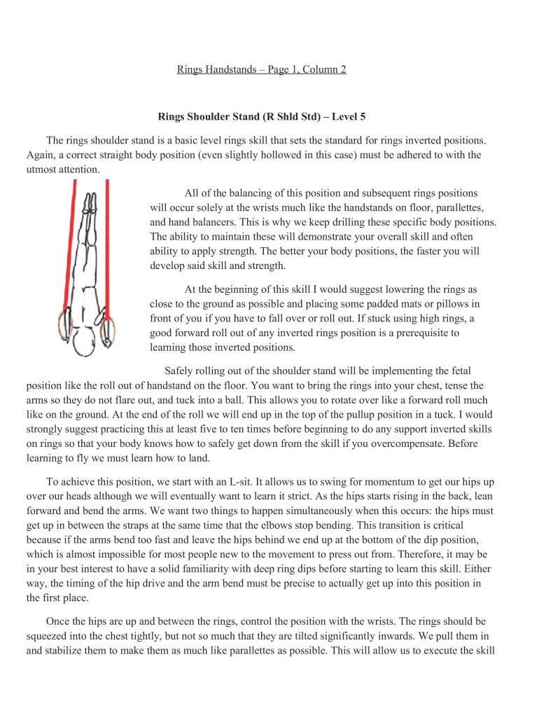 front of you if you have to fall over or roll out. If stuck using high rings, a good forward roll out of any inverted rings position is a prerequisite to learning those inverted positions.