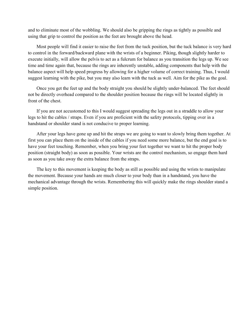 The key to this movement is keeping the body as still as possible and using the wrists to manipulate the movement. Because your hands are much closer to your body than in a handstand, you have the mechanical advantage through the wrists. Remembering this will quickly make the rings shoulder stand a simple position,