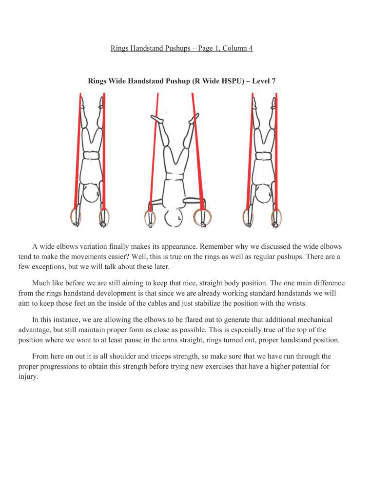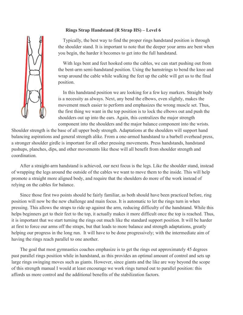 The goal that most gymnastics coaches emphasize is to get the rings out approximately 43 degrees past parallel rings position while in handstand, as this provides an optimal amount of control and sets up large rings swinging moves such as giants. However, since giants and the like are way beyond the scope of this strength manual I would at least encourage we work rings turned out to parallel position: this affords us more control and the additional benefits of the stabilization factors.