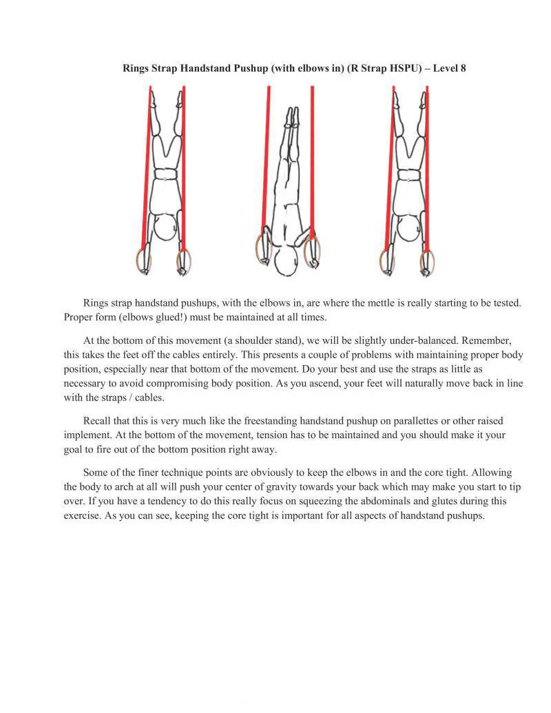 Since those first two points should be fairly familiar, as both should have been practiced before, ring position will now be the new challenge and main focus. It is automatic to let the rings turn in when pressing. This allows the straps to ride up against the arm, reducing difficulty of the handstand. While this helps beginners get to their feet to the top, it actually makes it more difficult once the top is reached. Thus, it is important that we start tuming the rings out much like the standard support position. It will be harder at first to force our arms off the straps, but that leads to more balance and strength adaptations, greatly helping our progress in the long run. It will have to be done progressively; with the intermediate aim of having the rings reach parallel to one another.