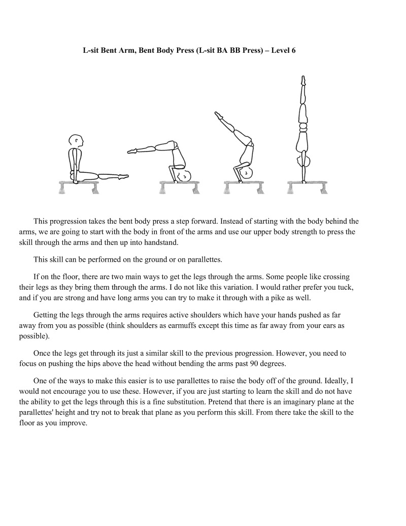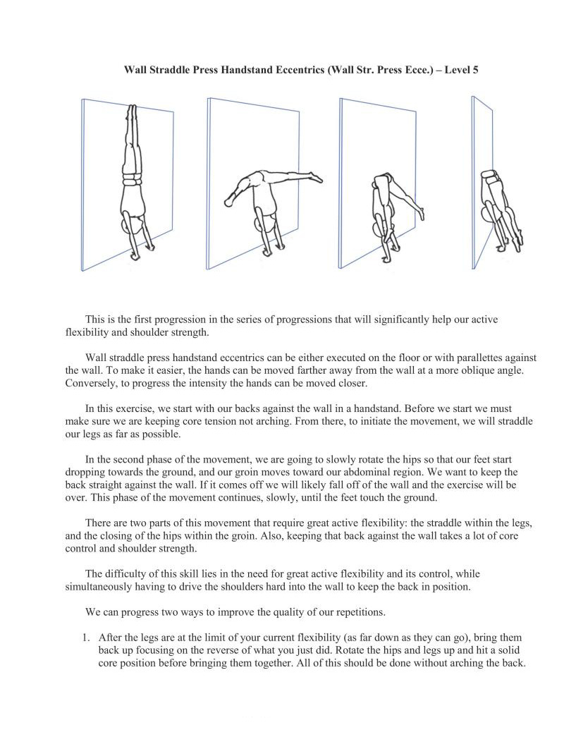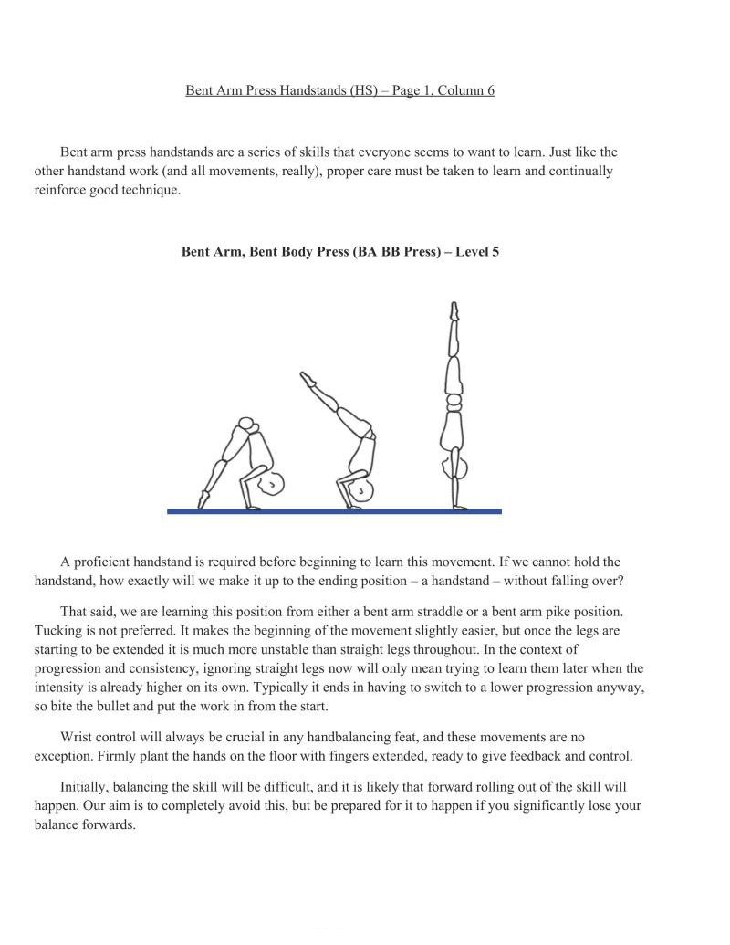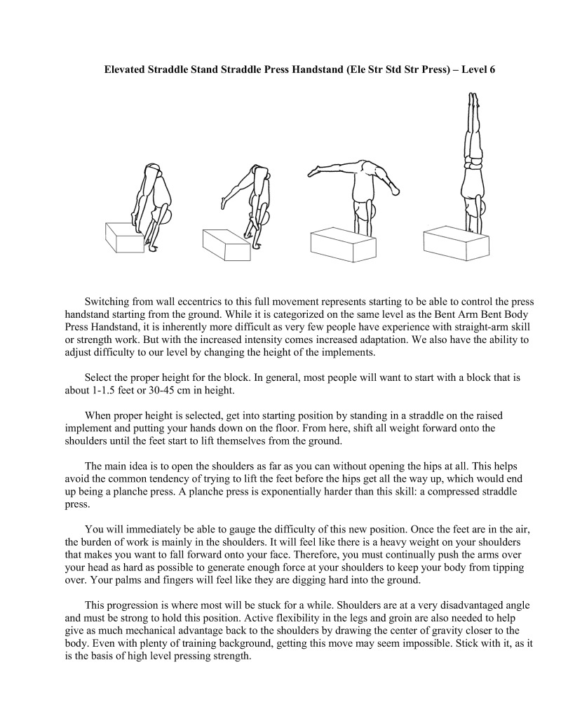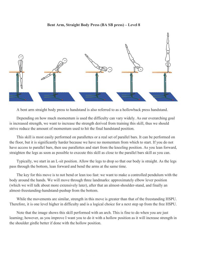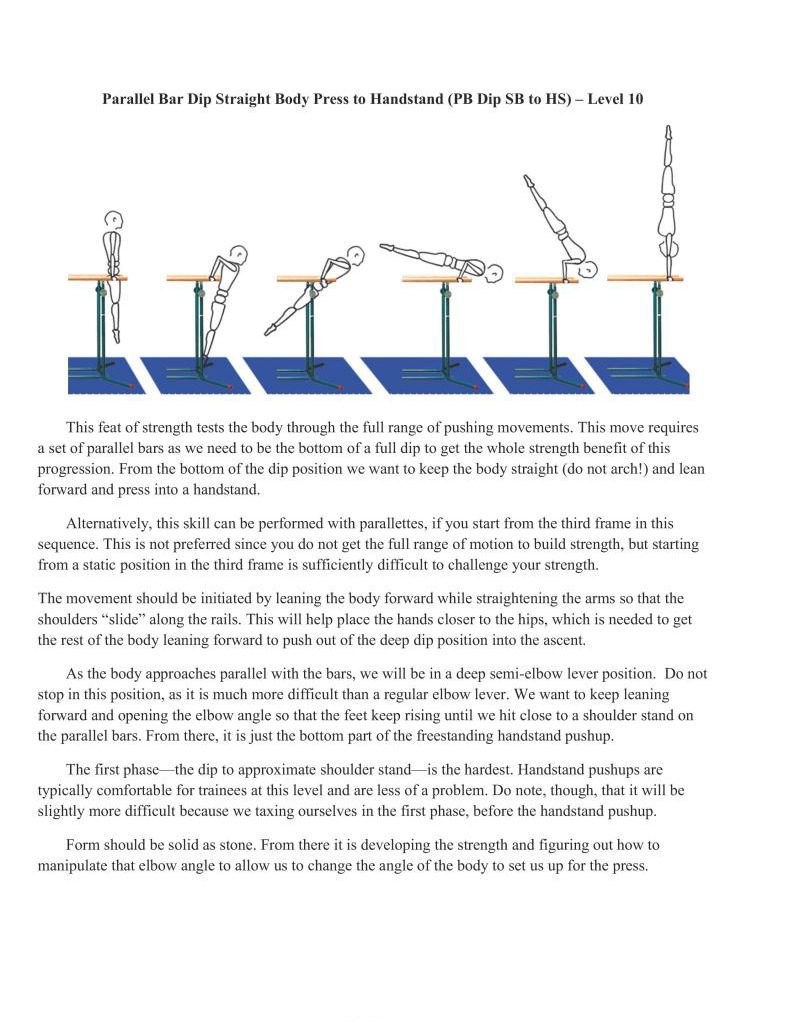 Switching from wall eccentrics to this full movement represents starting to be able to control the press handstand starting from the ground. While it is categorized on the same level as the Bent Arm Bent Body Press Handstand, it is inherently more difficult as very few people have experience with straight-arm skill or strength work. But with the increased intensity comes increased adaptation. We also have the ability to adjust difficulty to our level by changing the height of the implements.