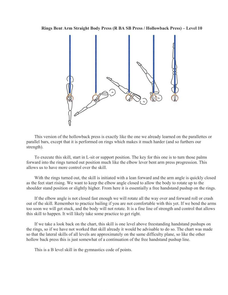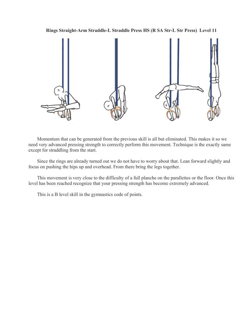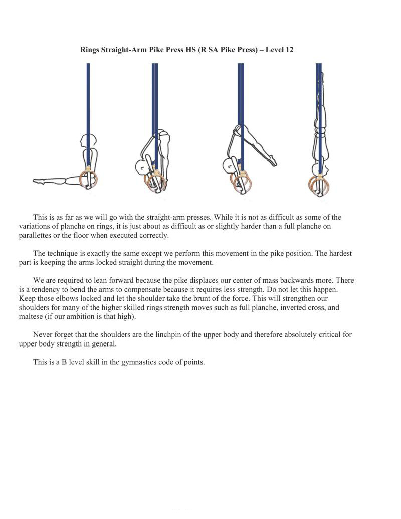 This is as far as we will go with the straight-arm presses. While it is not as difficult as some of the variations of planche on rings, it is just about as difficult as or slightly harder than a full planche on parallettes or the floor when executed correctly.