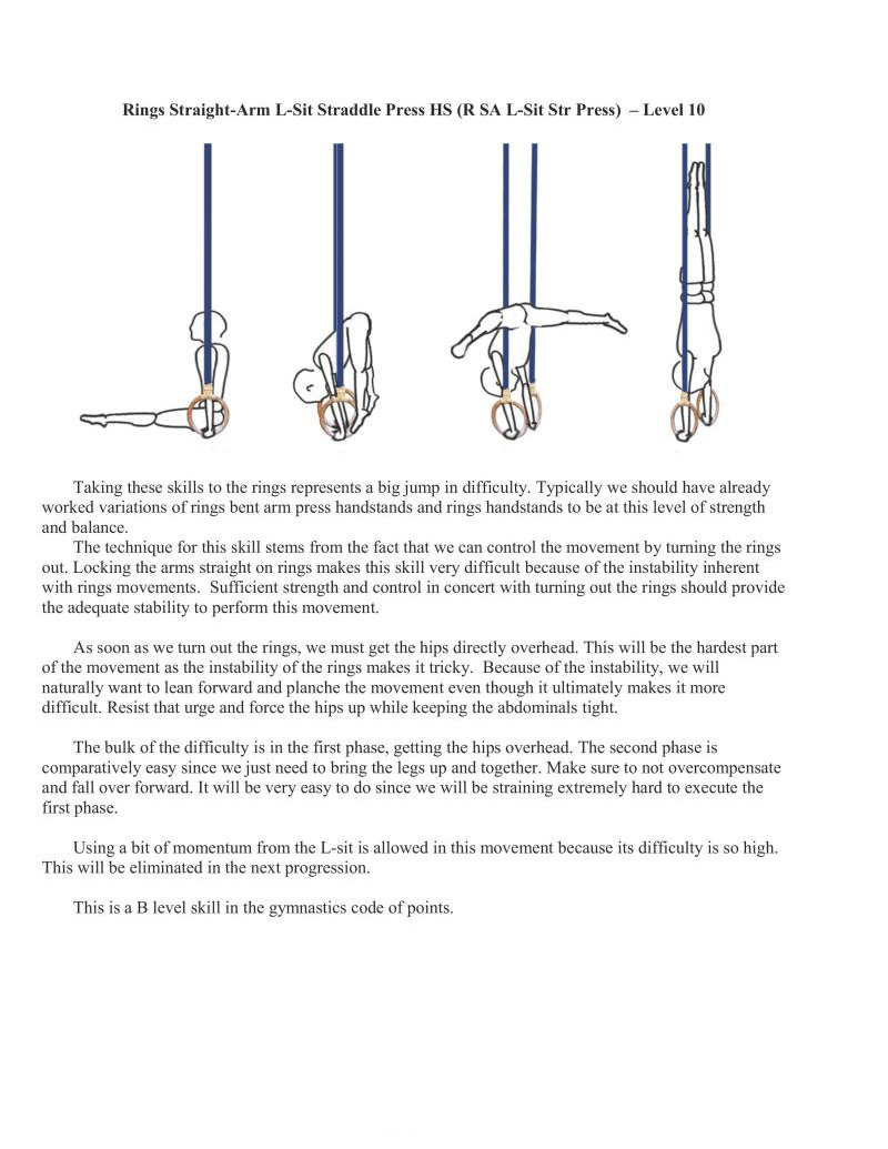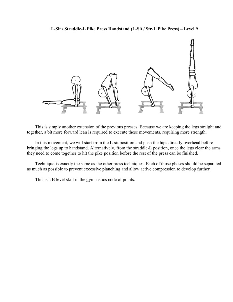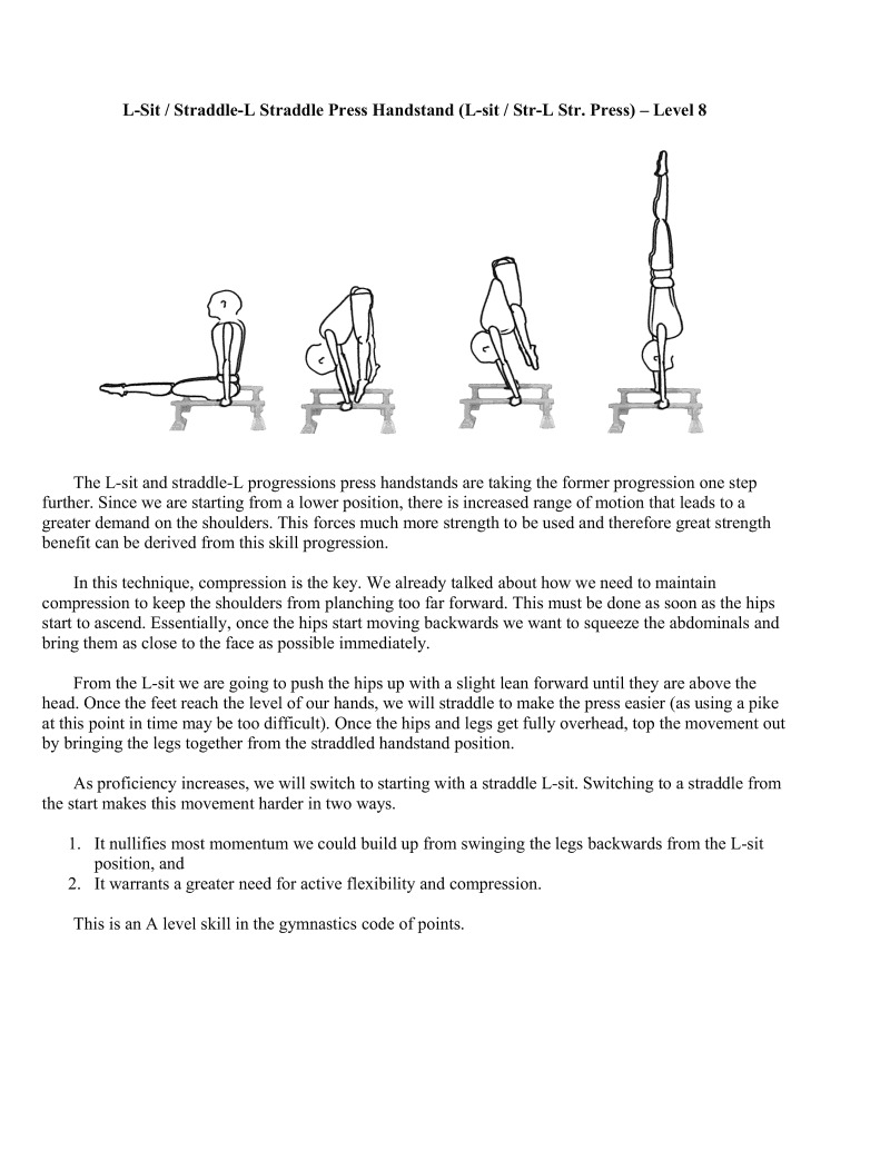 The L-Sit and straddle-L progressions press handstands are taking the former progression one step further. Since we are starting from a lower position, there is increased range of motion that leads to greater demand on the shoulders. This forces much more strength to be used and therefore great strength benefit can be derived from this skill progression.