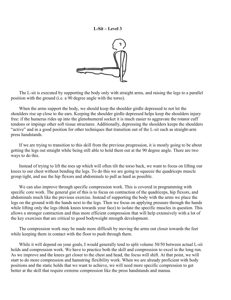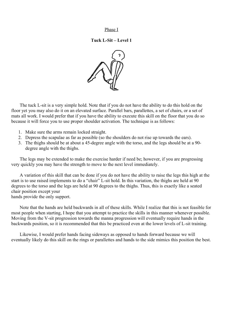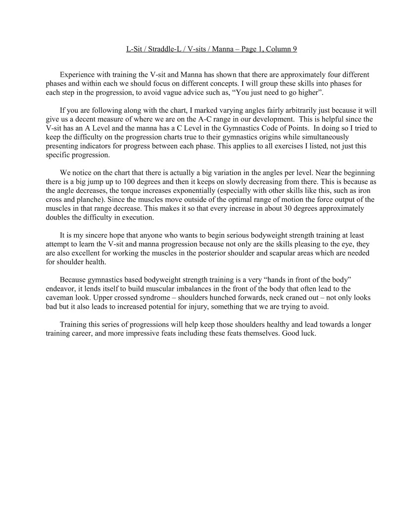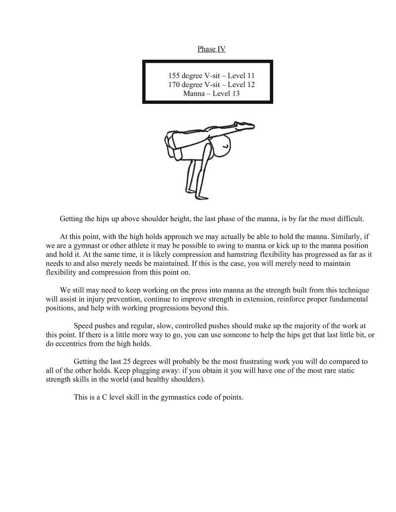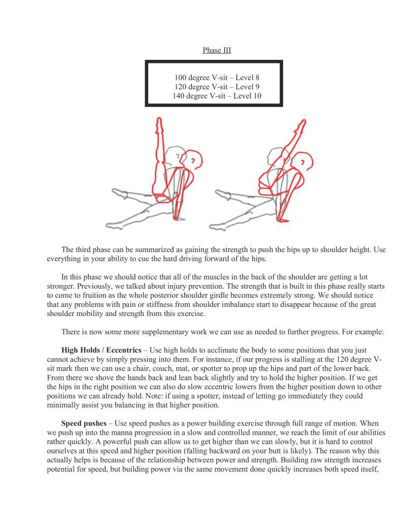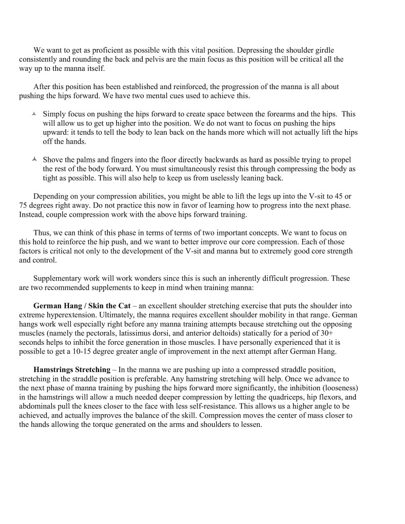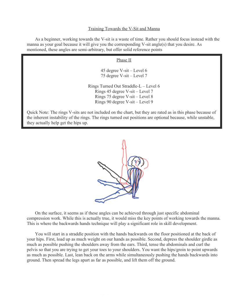 It is my sincere hope that anyone who wants to begin serious bodyweight strength training at least attempt to learn the V-sit and manna progression because not only are the skills pleasing to the eye, they are also excellent for working the muscles in the posterior shoulder and scapular areas which are needed for shoulder health.
