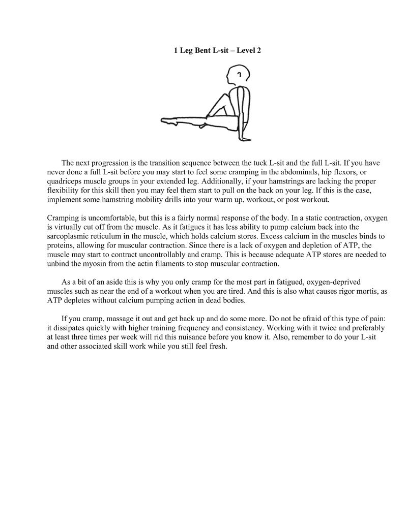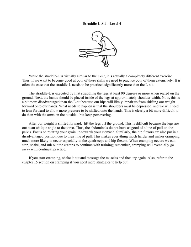 If you cramp, massage it out and get back up and do some more. Do not be afraid of this type of pain: it dissipates quickly with higher training frequency and consistency. Working with it twice and preferably at least three times per week will rid this nuisance before you know it. Also, remember to do your L-sit and other associated skill work while you still feel fresh.