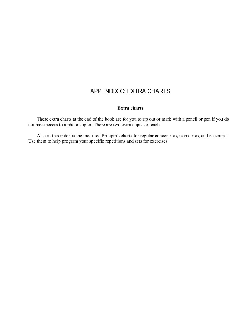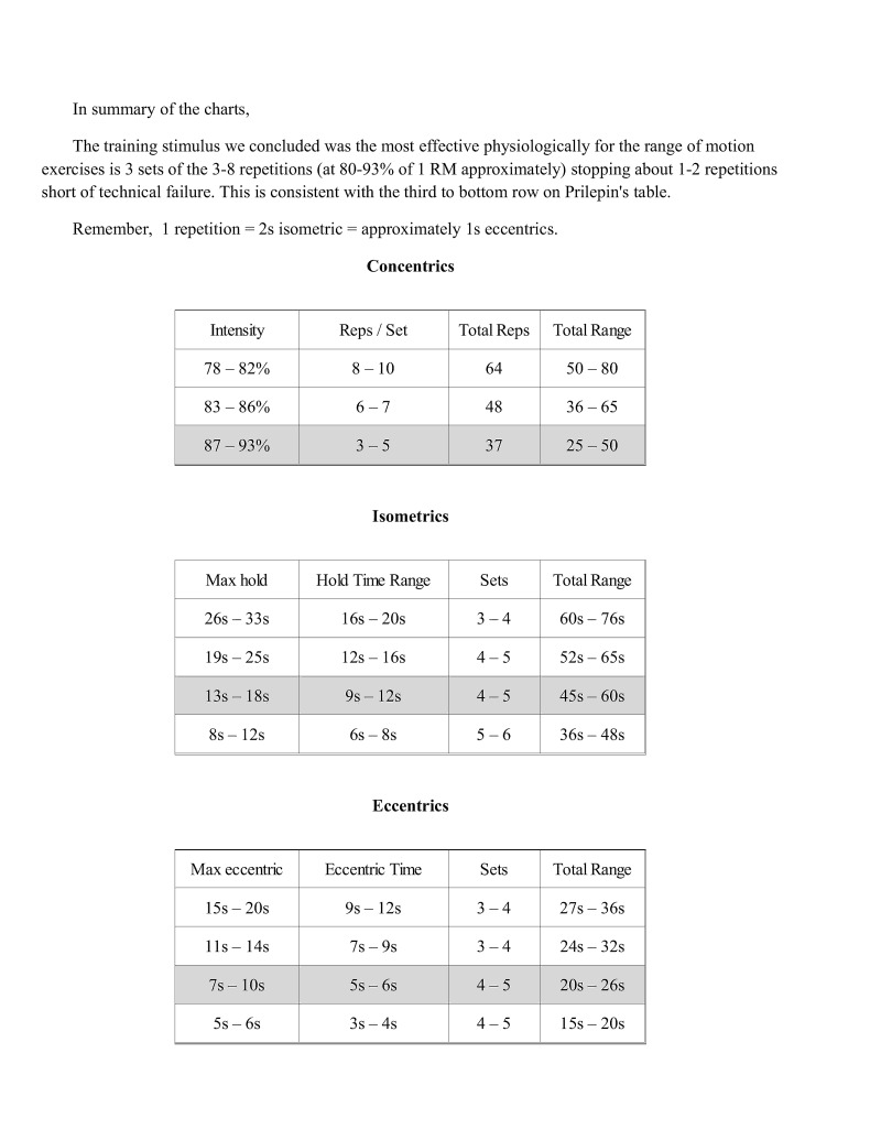 Also in this index is the modified Prilepin's charts for regular concentrics, isometrics, and eccentrics. Use them to help program your specific repetitions and sets for exercises.