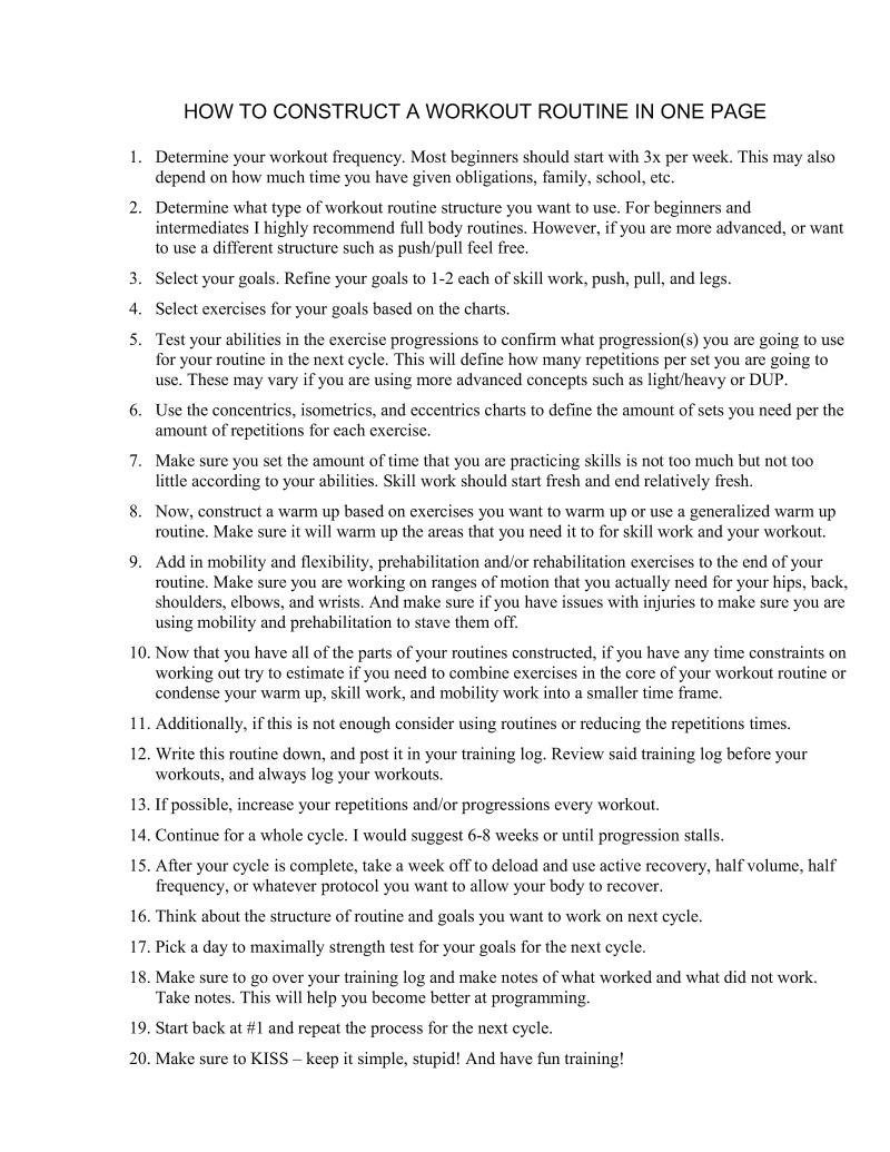 Test your abilities in the exercise progressions to confirm what progression(s) you are going to use for your routine in the next cycle. This will define how many repetitions per set you are going to use. These may vary if you are using more advanced concepts such as light/heavy or DUP.